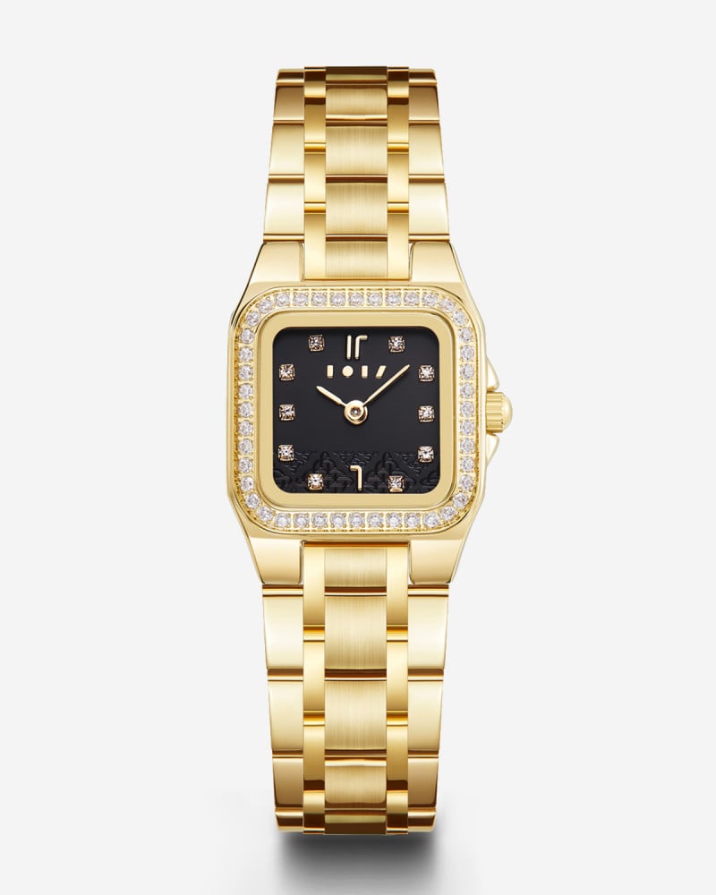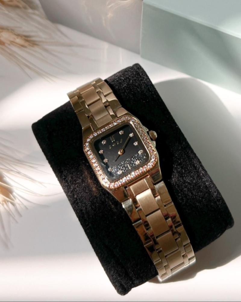 - إطار الساعة من الستيل باللون الذهبي الفاخر ومرصع بفصوص الزركون البراقة