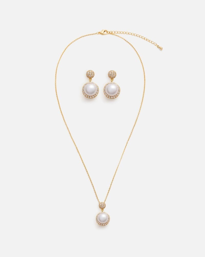 طقم نسائي من حلق وسلسال بتصميم راقي باللون الذهبي ، سلسال وحلق بتصميم حلية بشكل لؤلؤة مرصعة بفصوص الزركون البراقة تضفي لمسة من الجاذبية ، اضيفي لمسه أنثويه راقيه الى طلتك مع هذا الطقم ، يمكنك ارتداء الطقم في كل الأوقات .