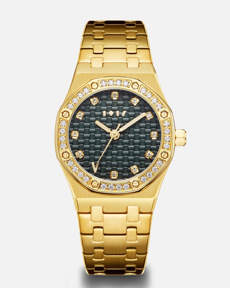 إطار الساعة من الستيل باللون الذهبي الفاخر والمرصع بفصوص الزركون البراقة