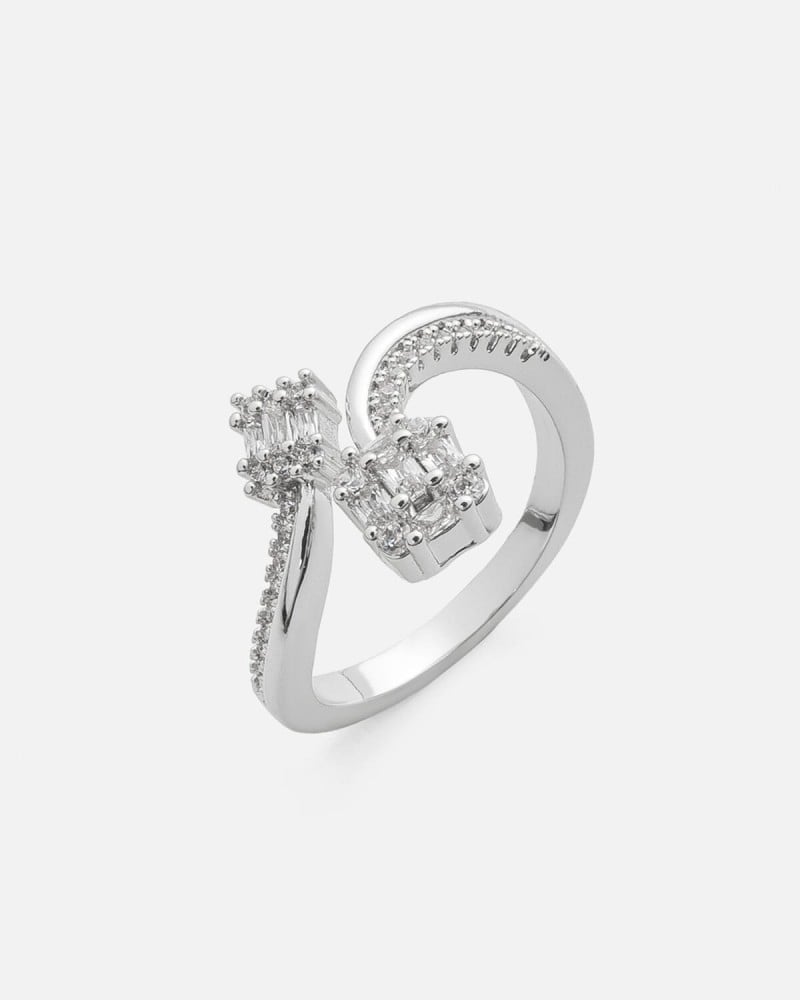 خاتم نسائي بتصميم كلاسيك باللون الفضي، خاتم بتصميم متداخل يتزين بحلي هندسية مرصعه بفصوص من الزركون اللامع ، اضيفي لمسه أنثويه راقيه الى طلتك مع هذا الخاتم ، خاتم يناسب إطلالتك المسائية .